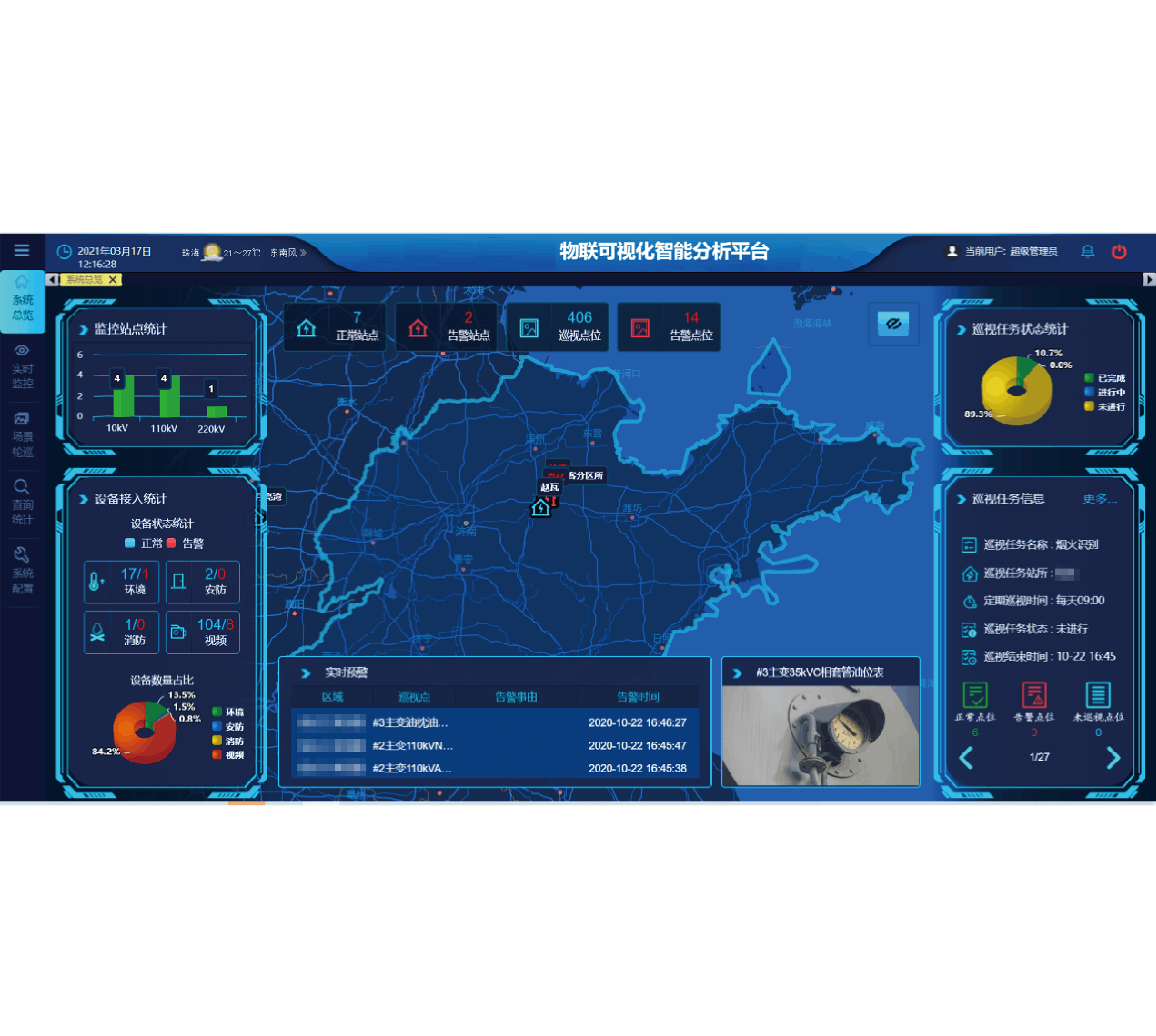 利用人工智能、物联网、移动互联、视频/图像、状态感知等技术,结合以场景和应用为基础的云管边端的技术架构,实现配电网各场景的电气设备状态、环境、安防、外力破坏、火灾等数据信息的监测、整合及预警处理,实时反映现场运行工况,顺利获得联动控制,保证配电网安全运行,防止因环境改变、非授权活动、设备状态变化等引起的事故,满足对配电网远程运维的可靠管控。