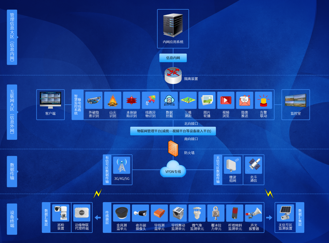 The data of the perception layer of the transmission line is transmitted to the equipment access platform such as the "Internet of Things Management Platform" or "Unified Video Platform" through the VPN private network and the external network firewall. The device access platform data is retrieved through the northbound interface for application display, and the real-time picture can be transmitted to the information intranet through the isolation device, and the image capture instruction can be transmitted at the same time.